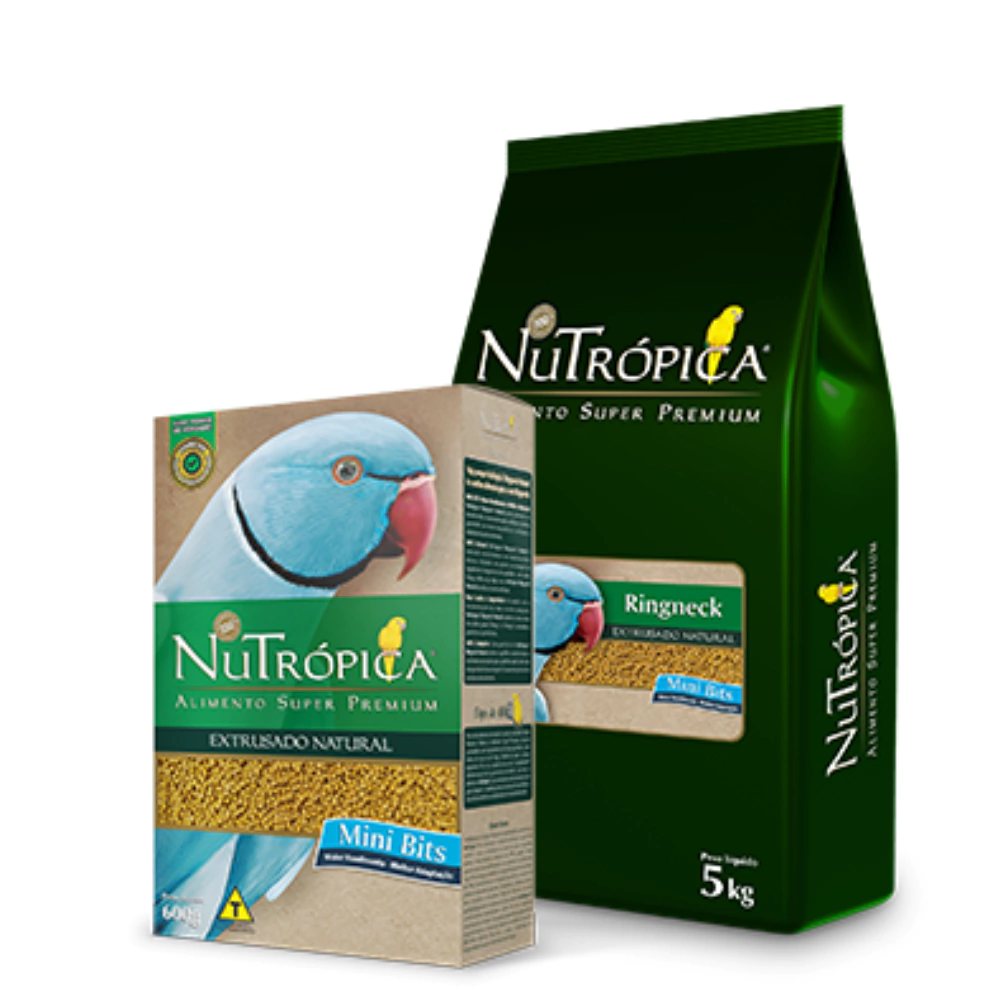 NuTrópica Ringneck Natural é um alimento extrusado completo, cientificamente formulado e especialmente desenvolvido para ringnecks e demais espécies do gênero Psittacula, como cabeças de ameixa, moustaches e grande alexandres. NuTrópica Ringneck Natural possui partículas pequenas, do mesmo tamanho das sementes tradicionalmente utilizadas na alimentação dos ringnecks. Estas partículas, chamadas de Mini Bits, possuem o tamanho ideal para garantir um melhor aproveitamento e reduzir o desperdício, além de facilitar a adaptação das aves ao alimento. Cada embalagem de NuTrópica Ringneck Natural contém uma combinação exclusiva dos mais nobres ingredientes integrais como aveia, linhaça, milho, soja, trigo e ovos, que juntos, proporcionam à sua ave uma alimentação saudável e equilibrada. NuTrópica Ringneck Natural é um alimento completo e inclui em sua composição todos os nutrientes necessários para que seu ringneck tenha uma vida longa e saudável.