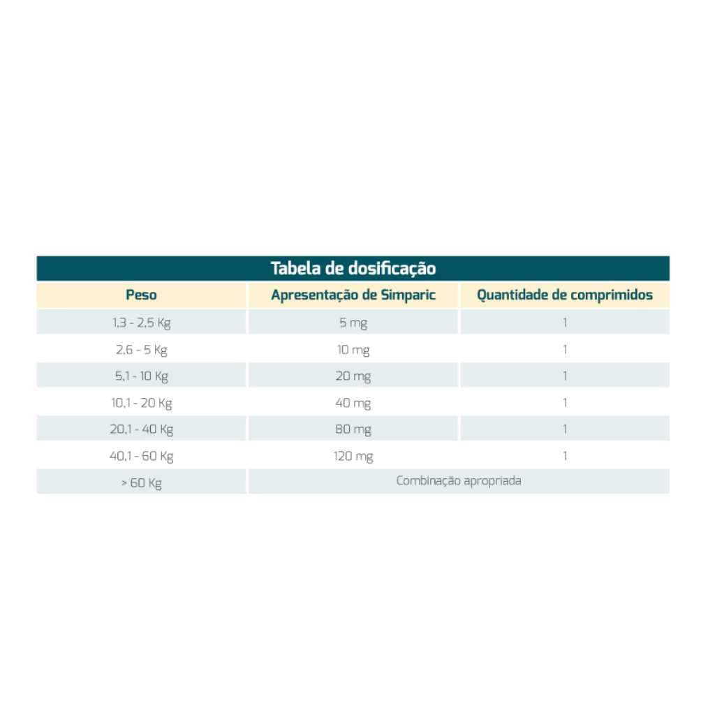 INDICAÇÕES: SIMPARIC é indicado para o tratamento e prevenção de infestações por pulgas (Ctenocephalides felis e Ctenocephalides canis) e tratamento e controle de infestações por carrapatos (Rhipicephalus sanguineus, Amblyomma americanum, Amblyomma maculatum, Dermacentor variabilis, Dermacentor reticulatus, Ixodes scapularis, Ixodes ricinus, Ixodes holocyclus, Ixodes hexagonus, Haemaphysalis longicornis, Haemaphysalis elliptica). SIMPARIC é também indicado para o tratamento e prevenção de sarna causada por Sarcoptes scabiei e Demodex canis e também, para o tratamento e prevenção de Otodectes cynotis (ácaro da orelha). SIMPARIC comprimidos mastigáveis auxilia na prevenção da transmissão de Borrelia burgdorferi (Doença de Lyme) e Anaplasma phagocytophilum pelo carrapato Ixodes scapularis, e Babesia canis pelo carrapato Dermacentor reticulatus. ADMINISTRAÇÃO: SIMPARIC comprimidos mastigáveis são administrados por via oral, uma vez por mês, na dosagem mínima recomendada de 2 mg/kg.